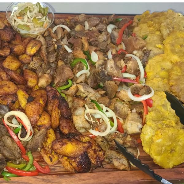 Plateau fritay (griot, taso, saucisse, banane, pâté codé, akra, marinad, pikliz) Fritay platter with pork, turkey, sausage, plantains, pastries, fritters & pikliz.